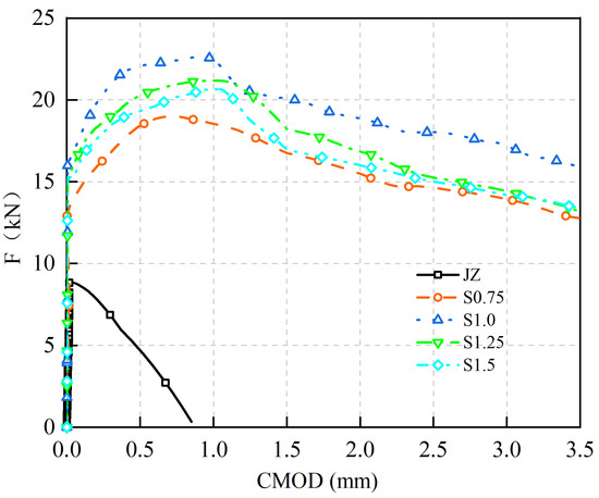 F-CMOD curves of concrete specimens with steel fiber of 0% to 1.5% are shown in Figure 10.