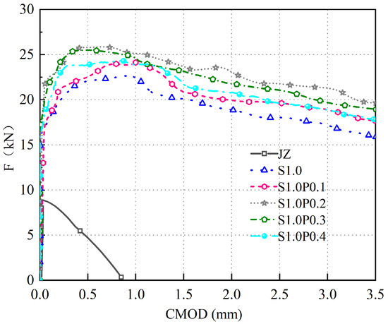 The F-CMOD curves for concrete specimens with varying volumes of S-PVA HF are shown in Figure 11.