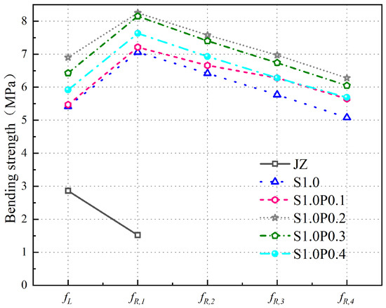 Comparative analysis of previous research results shows that Liu [42] found a similar finding. Namely, that as the PVA fiber continues to increase, the deformation ability of concrete will decrease. However, the reason for the difference in the optimal found in this article may be due to the different sizes of coarse aggregate and different concrete. In general, when 1.0% steel fiber and 0.2% PVA fiber are mixed, the of panel concrete is the highest.