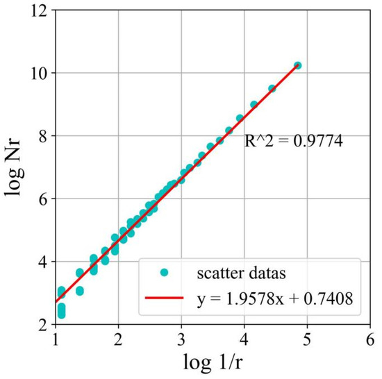 Gangepain and Roques-Carms introduced the fractal dimension (D) measure based on box counting. This method involves calculating the minimum number of boxes required to cover the surface of an image. The size of the image is denoted as ‘L’, where ‘k’ represents the grid size and ‘Nr’ represents the number of boxes needed to cover the entire image. To determine D, a series of Nr values is calculated by varying the grid size ‘k’. Then, a linear regression is performed on the pairs of points {log(1/r), log(Nr)}. The slope of the regression line corresponds to the D value, as described in Equation (4).