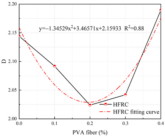 - PVA fibers further enhance the and the enveloping area of the F-CMOD curve in SFRC. When the PVA fiber increases from 0.1% to 0.4%, the of S-PVA HFRC initially increases and then decreases. At 1.0% of steel fibers and 0.2% of PVA fibers, the S-PVA HFRC exhibits the highest . Compared to concrete with 1.0% steel fiber , the is increased from 7.25 MPa to 8.28 MPa, representing a 14.2% improvement.