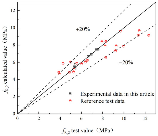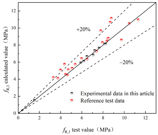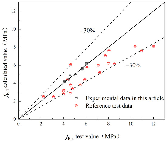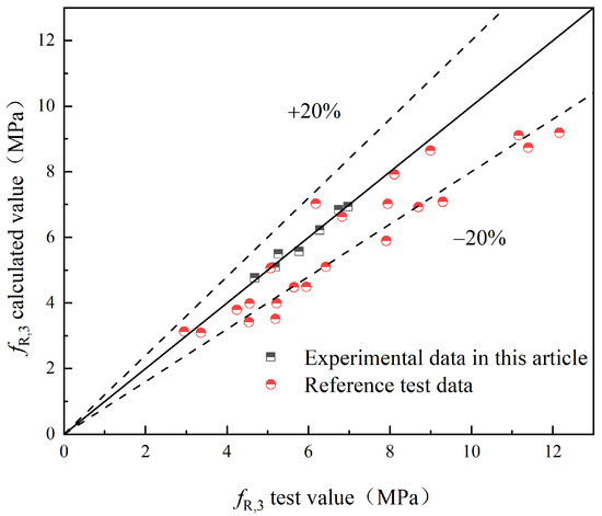 - A flexural strength prediction model for HFRC was developed, considering the influence of hybrid fibers on the concrete’s flexural strength. The reliability of the model was verified through experimental data.