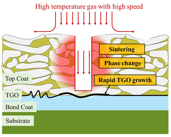 Figure 1. Schematic diagram of over-temperature damage in localized spallation region of TBCs.