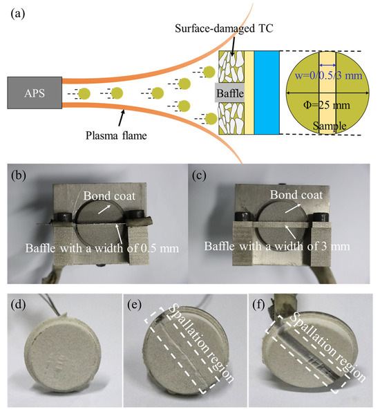 Figure 3. (a) Spraying process for TC layer, two baffles used for TBC samples with spallation widths of (b) 0.5 mm, and (c) 3 mm before the spraying of TC layer, and TBC samples with spallation widths of (d) 0 mm, (e) 0.5 mm, and (f) 3 mm.
