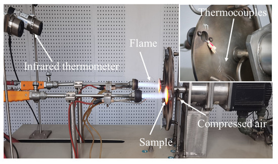 Thermal insulation tests were conducted on the localized spallation of TBCs to obtain the temperature values at the edge of the spallation region on the TC surface, as well as location 1 and location 2 on the exposed BC surface, thereby revealing the temperature variations influenced by the localized spallation. The tests were carried out using a gas burner rig test facility (Figure 5), where propane and oxygen were used as fuels. The TC surface was heated by gas flame, and the SUB back face was cooled with compressed air. A constant group of test parameters was selected: the distance between the flame nozzle and the sample surface was 100 mm, the flow rates of oxygen and propane were 7.5 L/min and 1.4 L/min, and the compressed air flow rate on the SUB back face was 25 L/min.