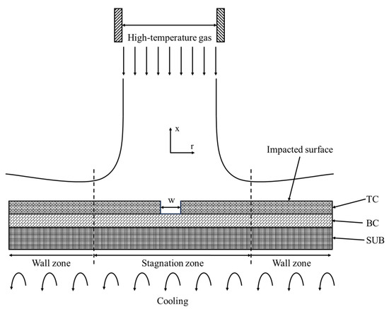 To understand the effect of spallation width on the temperature distribution in the localized spallation region of TBCs in-depth, and identify the over-temperature phenomenon and the relevant influencing mechanisms, the numerical model of the localized spallation of TBCs was constructed, and a numerical analysis was conducted. When the localized spallation region interacts with the high-temperature gas, complicated flow characteristics and unpredictable temperature distributions may occur in the localized spallation region (Figure 1), which is difficult to investigate by the fixed temperature boundary condition in most of the previous research [24,25]. Thus, to explore the accurate temperature distributions in the spallation region, a conjugate heat transfer (CHT) numerical model of the localized spallation of TBCs under high-temperature gas was developed.