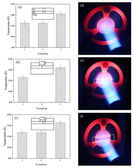 Figure 7 displays the measured temperature values and photographs of the TBC’s surface under a high-temperature flame. It was seen that once the spallation occurred in the TBCs, the temperatures on the TC surface and the exposed BC surface rose significantly. When the spallation width increased from 0 mm to 0.5 mm (Figure 7a,b), the temperature increase on the TC surface was approximately 20 K, which was larger than the temperature increase of about 10 K when the spallation width increased from 1 mm to 3 mm (Figure 7b,c). The edge of the spallation region was brighter than the other regions on the TC surface, indicating that the temperature in the spallation edge was higher than that in the other locations (Figure 7d–f). This was attributed to the scouring effect of the airflow, and can be considered as the over-temperature phenomenon of the localized spallation of TBCs.