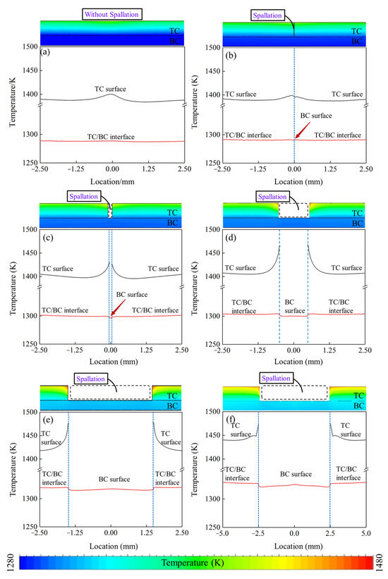 For the temperature along the exposed BC surface in the localized spallation region, the results revealed that when the TBC was intact or the spallation width was less than 10 μm (Figure 8a,b), the maximum temperatures at the exposed BC surface were almost identical at 1289 K and 1292 K, and the temperature variation along the exposed BC surface could be negligible. While, when the spallation reached 100 μm (Figure 8c), a considerable increase in both the overall temperature and temperature variation along the exposed BC surface occurred, with maximum values of 1298 K and 5 K, respectively. Additionally, due to the extremely high temperature at the edge of the spallation region on the TC surface, the temperature in the TC–BC interface below the spallation edge was higher than the temperature in the exposed surface of the BC layer in the spallation region. As the spallation width enlarged to 1 mm (Figure 8d), the maximum temperature and temperature variation continued to rise to approximately 1304 K and 5 K. Once the spallation continuously expanded to 3 mm (Figure 8e), the maximum temperature at the exposed BC surface dramatically increased to 1320 K. With further enlargement of the spallation (Figure 8f), the maximum temperature and temperature variation had a lower rise, and the values were about 1326 K and 10 K, respectively.