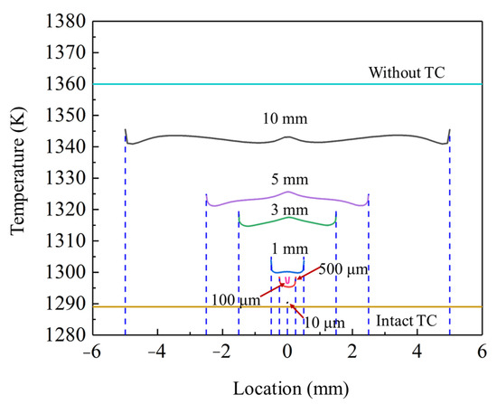 Figure 9 summarizes the exposed BC surface temperature distributions with different spallation widths, considering the TBCs without TC and with intact TC as the limiting conditions. The results indicated that when the spallation width was less than 10 μm, the temperature in the localized spallation region was nearly identical to the minimum limiting value. As the spallation width increased beyond 100 μm, the overall temperature experienced a small increment. Once the spallation width exceeded 3 mm, the temperature value sharply rose and gradually approached the maximum limiting value.
