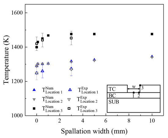 To compare experimental and numerical results, the maximum temperature values at the key locations were analyzed. The experimental results, taken from the measurement points in Figure 7, were compared to the numerical data at similar positions to those in the experiments. Once the spallation occurred in TBCs, the temperature in the TC layer and BC layer increased rapidly. Meanwhile, as the spallation width increased, experiments and simulations both showed that the temperature of the TC layer first rapidly increased and then slowly increased, while the temperature of the BC layer first slowly increased and then rapidly increased. Therefore, the evolution law of the numerical results was the same as that of the experimental results, and the maximum error was within 5%, as shown in Figure 10. However, as the exposed temperature measured by the thermocouple was the average temperature within a diameter of 0.5 mm, the temperatures at location 1 and location 2 were lower than that in the simulation.