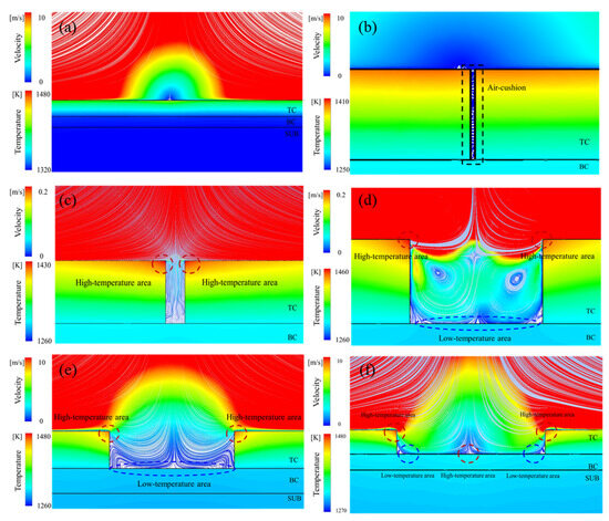 Figure 11. The distributions of streamline and temperature in TBCs with spallation widths of (a) 0 μm, (b) 10 μm, (c) 100 μm, (d) 500 μm, (e) 1000 μm, and (f) 3000 μm.