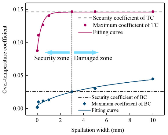 The sintering temperature T s of TC (8YSZ) was 1473 K, and that of BC (NiCoCrAlY) was 1323 K [34]. Therefore, the security coefficients ζ of the TC and BC layers were considered as 0.143 and 0.026, respectively. According to the nonlinear fitting results, the over-temperature coefficients of the TC and BC layer were simultaneously close to the security coefficient when the spallation width reached about 3 mm, as shown in Figure 12. Under this condition, the performance of TBCs degraded rapidly, which may be difficult to service safely and provide thermal protection for turbine blades. This spallation width can be considered as the critical width for the availability evaluation of localized spallation of TBCs. Here, the spallation width of the TC layer greater than 3 mm in one direction can be considered as failure, which is consistent with the failure criterion for TBCs based on experience in actual application [41].