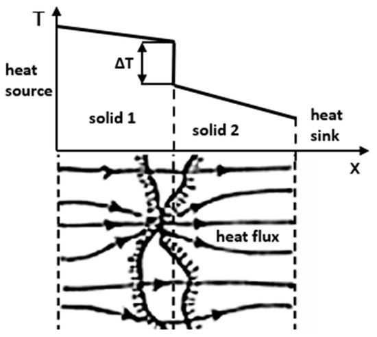 Contact thermal resistance causes a drop in temperature at the interface (Figure 2) since the surface roughness causes a decrease in the actual contact area between two surfaces compared to the apparent contact area [16]—Equation (1). The resistance depends on a contact area, which is determined by the surface roughness and the level of replacement of the air gaps by the thermal paste, which depends on the particle size (Figure 2). The existence of air gaps is undesirable because air has very low thermal conductivity ~0.026 W/(m∙K) [17] compared to the TIM 1–5 W/(m∙K) [9].