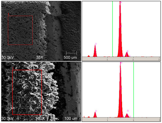 Analyzed samples of thermal interface material (TIM) were made of thermally conductive silicon-based material with a pasty consistency, ensuring physical stability. It can be used as prefabricated thermal pads; a liquid gap filler, cured after dispensing (two-component materials); or a liquid not-curing gap filler (one-component material) [24]. Images of the material samples were made to observe the surface of the grains in terms of their shape. The research was carried out using SEM using a JEOL 5500 LV microscope with high resolving power and a Field Emission Gun (FEG) electron source. The topography of the sample was examined using semiconductor detectors. The beam energy was 30 keV. In selected areas, the chemical composition in microareas was analyzed using the EDS Ultim Max detector manufactured by Oxford Instruments. The chemical composition was analyzed as a map of the distribution of elements on the grain surface. Research was carried out on representative areas at a magnification of 35× and 100×. In Figure 3, which shows the composition of the material, mainly aluminum (Al), silicon (Si), and oxygen (O) are visible.