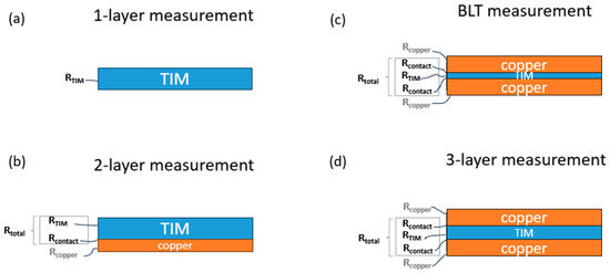 Different methods of measuring thermal resistance (a) single-layer material, (b) two-layer method, (c) BLT method, (d) three-layer method.