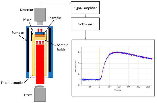 LFA is a transient, non-contact method used to measure thermal diffusivity for a wide range of materials [28]. The tests in this work were carried out on Netzsch equipment (Selb, Germany) LFA 427, which is characterized by an uncertainty of 3% for thermal diffusivity, a range of 0.01 mm2/s to 1000 mm2/s, and high reproducibility throughout the application range from 20 °C to 2000 °C [29,30]. The principle operation of LFA is shown in Figure 7. The laser emitter generates a short laser pulse directed to the bottom side of the sample and its length is from 0.3 to 1.2 ms for LFA 427 [29]. The laser energy absorbed by the sample surface is up to 20 Joules per pulse, and the duration of the pulse is dependent on the sample type. The temperature of the upper surface is measured by an infrared detector over time, and the thermal diffusivity is calculated directly from the t1/2 coming from the curve (Figure 7) [22].