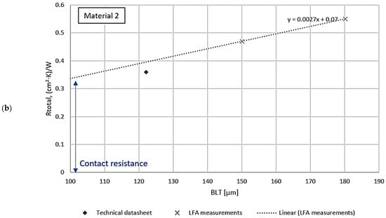 The third part of the measurement procedure was the analysis of the BLT system and the three-layer measurement. The physical construction of the sample was the same for both methods (Figure 5c,d). The difference was a definition of the Proteus LFA Analysis v. 4.8.5 and v. 8.0.3 and the output parameters. In the BLT method, the definition is provided as a two-layer system, and the output parameter is the thermal resistance. For a three-layer system, the definition of the system is the three-layer measurements and the thermal diffusivity in a direct output parameter. The BLT test may be performed when the layer is very thin, ensuring at least minor contact between solid materials [36]. For thicker samples, measurements have to be performed in a three-layer approach. For the materials examined, the BLT limit had been established at 200 µm [37], based on similar analyses available in the TIM technical data sheets. The total thermal resistance increased with the BLT value.