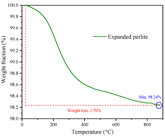 The EP used in the hot-mix asphalt mixture should possess good thermal stability. The weight loss of the EP in the range of 20 °C to 900 °C is shown in Figure 5. In Figure 5, the mass loss of the EP at 900 °C is only 1.76%, indicating that the EP has good thermal stability and can be used as filler for hot-mix asphalt mixtures.