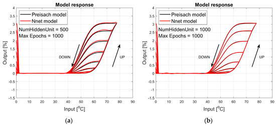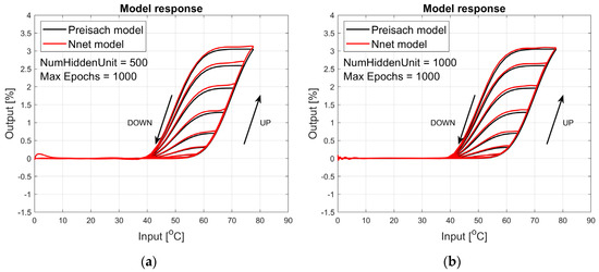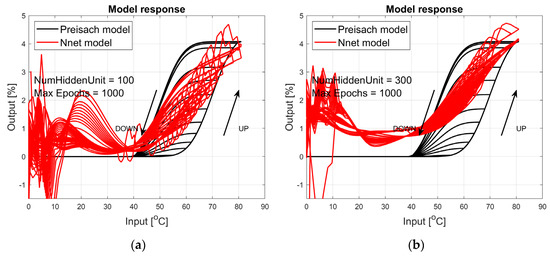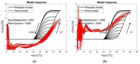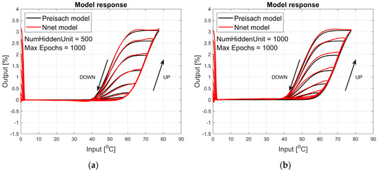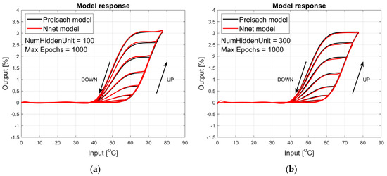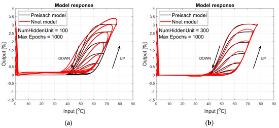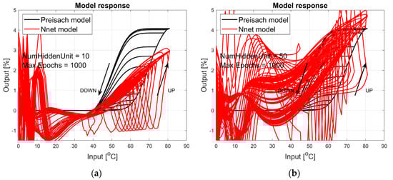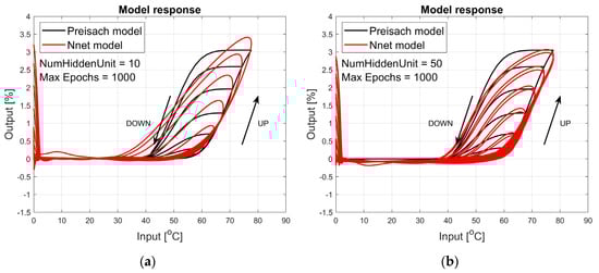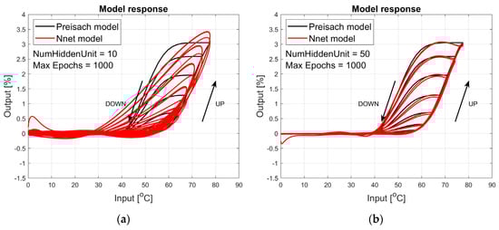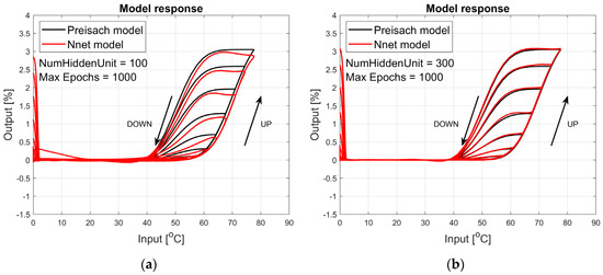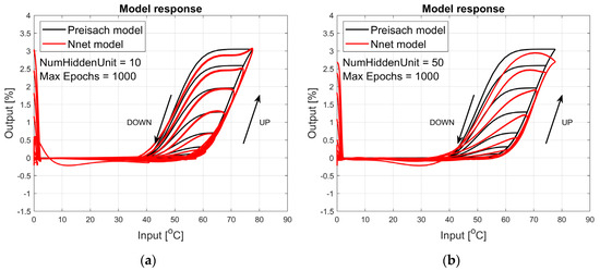 Each figure shows the reference response obtained from the Preisach model drawn with a solid black line and the response of the trained ANN drawn with a solid red line. Each of the figures includes basic information about a number of hidden units and a number of training epochs. The arrows show the branches responding to increasing (up arrow) and decreasing (down arrow) input signals. The response is a relative displacement understood as the percentage shortening of the SMA length of the wire in response to a change in wire temperature.
