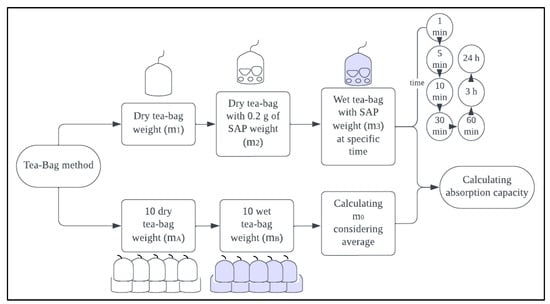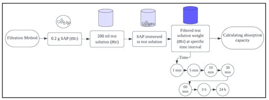 In the filtration method, the dry amount of 0.2 g of SAP was measured as mass , and the test solution of 200 mL was measured as mass . The test fluid was added to a beaker, and dry SAP was immersed. Immediately, the beaker was tightly sealed using a thin plastic film to prevent evaporation and carbonation. The entire solution was filtered after time intervals of 1, 5, 10, 30, 60 min, 3 h and 24 h from the SAP/liquid contact time, and the amount of filtered fluid was determined as mass . The filter paper (12–15 µm mesh size) used for filtering was saturated in the test solution before use, and the filtration was carried out using a funnel with filter paper. Different containers with new solutions and SAP were prepared for each testing interval. Equation (3) was used to calculate absorption capacity by filtration method.