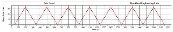 The torque required to rotate the spindle and the shear rate were determined. The samples were pre-sheared for 30 s at 33.15 s⁻1, followed by a 10 s rest. Then, the shear rate was ramped up from 0 to 33.15 s−1 and down from 33.15 to 0 s−1, which was repeated throughout the test duration of about 35 min, as shown in Figure 4. The shear rate at each step was maintained for 10 s to measure a stable shear stress. The curves obtained during the decreasing rate were more consistent. Furthermore, a linear regression was performed on the experimental data, plotting shear stress against shear rate. The slope and intercept of the plotted regression line were used to determine the plastic viscosity and yield stress [27]. The evaluations were conducted at 5, 10, 15, 20, 25, 30, and 35 min.