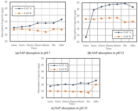 SAP’s initial absorption capacity was lower in all pH solutions; however, significantly lower initial absorption was noted in the pH 11 solution, as shown in Figure 5b. The absorption test was conducted twice to confirm the changes in SAP absorption in the pH 11 solution; however, it showed a similar trend each time. This may be due to small particles aggregating and swelling, leading to gel blocking. Over time, SAP A’s absorption capacity increased from 23.59 g/g at 1 min to 49.35 g/g at 3 h in pH 11. Furthermore, SAP A demonstrated an increase in absorptivity in all three pH solutions, with the highest absorption in pH 11 (46.65 g/g at 24 h) compared to pH 7 (36.74 g/g at 24 h) and pH 13 (33.20 g/g at 24 h).