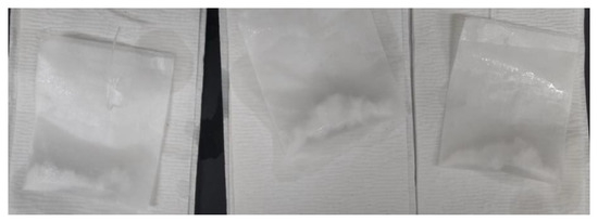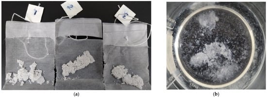 Furthermore, following RILEM guidelines [24,25], two testing methods—the ‘tea-bag method’ and the ‘filtration Method’—were used to investigate the absorption capacity of SAP, as shown in Figure 2 and Figure 3, respectively. In the tea-bag method, a dry tea bag was initially weighed as mass , and a dry tea bag containing 0.2 g of SAP was weighed as mass . The tea bag was then sealed to prevent any dry or swollen SAP from leaking out. Further, the SAP-filled tea bag was soaked in a beaker filled with the test solution (about 200 mL). During this process, the beaker was covered with a thin plastic film to prevent carbonation and evaporation. The soaked SAP-filled tea bag was removed at specific time intervals: 1, 5, 10, 30, 60 min, 3 h and 24 h after the SAP/liquid contact time. The tea bag was wrapped with a dry tissue, and a weight of 1 kg was placed on it for 60 s to remove surface water before measuring the weight. This was performed to avoid errors caused by manual pressure applied by hand while removing surface water from the tea bag [26]. Afterwards, the weight was recorded. Furthermore, was calculated by taking into consideration the average dry and wet weight of the tea bag as shown in Equation (1), where n is the number of tea bags used (total of 10 tea bags), and are the individual masses of the dry and wet tea bags, respectively. Consequently, the absorption capacity was calculated according to Equation (2).