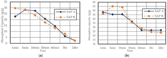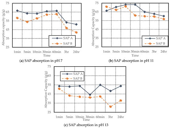 - Both SAPs demonstrated lower absorption in the cement filtrate solution (pH of 13.73). The absorption by SAP A, using the tea-bag and filtration methods at 1 min, was 22.68 g/g and 48.06 g/g, respectively, then decreased to 2.19 g/g and 26.54 g/g after 24 h. Similarly, for SAP B, the absorption capacity using the tea-bag and filtration methods at 1 min was 29.74 g/g and 46.39 g/g, respectively, which then decreased to 2.31 g/g and 23.55 g/g after 24 h, respectively.