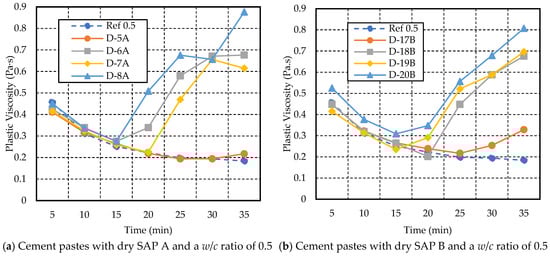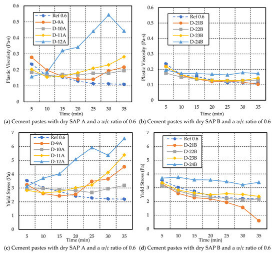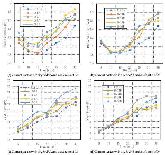 Examining Figure 10a,b for cement paste with a w/c ratio of 0.4, it is evident that the plastic viscosity increased with the dosage of SAP A and SAP B from 0.2% to 0.5%, compared to the reference mixes. Similar behavior was observed in a study carried out by [37]. However, after 35 min, a reduction in viscosity was noted for D-4A (1.73 Pa·s) compared to D-1A (1.75 Pa·s) and D-3A (1.86 Pa·s) mixes. Whereas, cement paste with a lower content of SAP B (D-13B) showed higher viscosity (1.76 Pa·s) at 30 min than mixes with a higher SAP dosage, i.e., D-14B (1.67 Pa·s) and D-15B (1.60 Pa·s).
