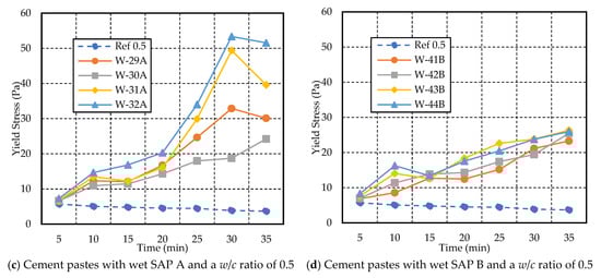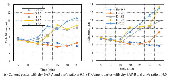 The yield stress of the paste with 0.2% SAP A and B was lower than the reference mix from 5 min to 25 min, after which an increase was noted, as shown in Figure 11c,d. A higher dosage of SAP A (D-8A) and B (D-20B) led to an increase in yield stress. At 35 min, it was the highest, i.e., 10.74 Pa and 13.04 Pa, respectively, compared to the reference mix, which was 3.68 Pa.