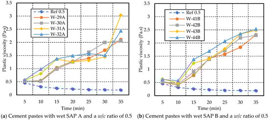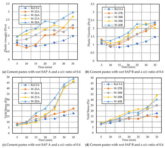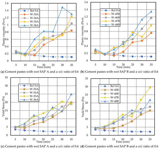 The cement pastes with a w/c of 0.4 and wet SAPs (presoaked for 30 min) showed higher plastic viscosity and yield stress with an increase in the dosage of SAP compared to the reference mixes and cement pastes with dry SAP, as shown in Figure 13. However, adding SAP A resulted in greater viscosity when compared to mixes with SAP B. The higher dosages of SAP A (W-28A) and SAP B (W-40B) showed an increase in viscosity, specifically 2.97 Pa·s and 2.39 Pa·s, respectively, in comparison to the viscosity of the Ref-0.4 mix, which measured 1.48 Pa·s at the end of the test duration. Furthermore, W-37B exhibited an increase in plastic viscosity from 1.32 Pa·s (at 20 min) to 2.24 Pa·s (at 35 min), which was quite close to W-38B, where it increased from 1.39 Pa·s (at 20 min) to 2.36 Pa·s (at 35 min).