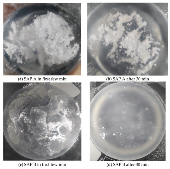 From the results of the tea-bag method presented in Figure 5, it is evident that SAP A exhibited a higher absorption capacity than SAP B despite having a smaller particle size. Likewise, a study by Kazemian and Shafei (2024) revealed that the fine-sized SAP exhibited a 10% higher absorption capacity when compared with the large SAP particles [28]. The smaller size of SAP A led to a delayed initial absorption, attributed to gel-blocking, as illustrated in Figure 6. Gel blocking is a characteristic of very fine SAP particles smaller than 100 µm. In this scenario, minimal absorption occurs on the surface when SAP encounters liquid, causing the slightly swollen particles to adhere to each other, forming clusters that contain a significant amount of unswollen SAP, hindering further disaggregation and absorption [2,29,30].