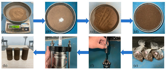 According to the standard for geotechnical test methods (GB/T50123-2019) [26], the sample sizes were 39.1 × 80 mm (diameter × height). Before sample preparation, silicone oil was evenly applied to the inner wall of the sample preparation device to prevent soil from sticking to it. The samples were prepared in five layers. To ensure better bonding between layers, scraping treatment was carried out after each layer was compacted. The sample preparation process is shown in Figure 1. A small stirrer was used during the mixing process to achieve a more uniform distribution of guar gum and basalt fibers in the soil.