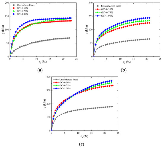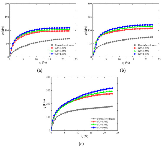 Influence of different contents of guar gum on stress–strain curves of solidified loess: (a) σ3 = 25 kPa; (b) σ3 = 50 kPa; (c) σ3 = 100 kPa.