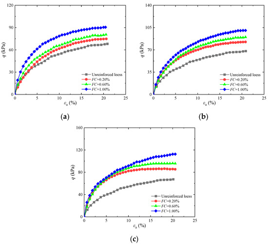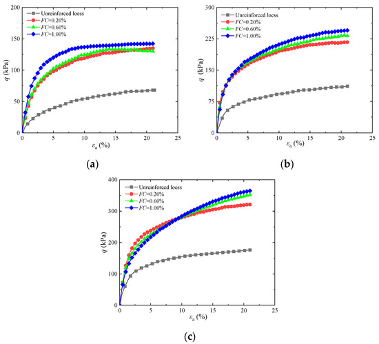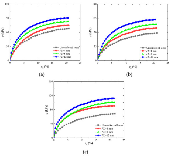 Influence of different basalt fiber contents on stress–strain diagram of reinforced soil: (a) FL = 4 mm; (b) FL = 8 mm; (c) FL = 12 mm.