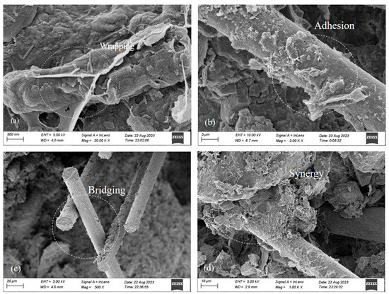 To study the action mechanism of the guar gum–basalt fiber synergistic solidification of loess, Figure 8 illustrates the microstructure of this solidification process. Figure 8a demonstrates the occurrence of the hydrosol phenomenon when guar gum interacts with water, effectively coating soil particles and preventing them from moving between particles, thereby improving soil strength. Figure 8b,c show guar gum aqueous solution attached to the fiber surface, with fibers overlapping to form a fiber gel–gum net structure. Single fibers can bridge together, limiting the relative sliding of soil particles through bending, embedding, and bridging. Multiple fibers can form a supporting network, creating a fiber network structure; soil particles interlock due to the network architecture, which restricts the deformation and displacement of soil particles. This is consistent with the conclusion in [14]. Guar gum attached to fibers strengthens their bridging effect and forms a “fiber–gel net” to stabilize the bridging between the fibers. Figure 8d presents how guar gum and basalt fiber work together; basalt fiber forms an anchorage zone in the soil to tightly lock soil particles, while guar gum wraps soil particles around it and stabilizes the interaction among multiple basalt fibers, forming a dual stability effect. When soil is stressed, the internal fibers endure tensile distortion of the soil, and guar gum hydrates fill some of the voids within the soil. This increases the soil compactness and enhances the contact area between the fibers and soil and the interaction force between interfaces, which results in better mechanical properties for fiber-reinforced soil.