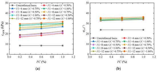 where c0 and cGFR are the initial and strengthened cohesion of loess, FL is the fiber length, FC is the fiber content, d is the fiber diameter, and GC is the guar gum content.