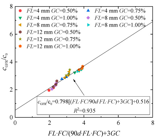 Figure 10 presents the fitting effect of the solidified loess with guar gum contents of 0.50%, 0.75%, and 1.00%, fiber contents of 0.20%, 0.60%, and 1.00%, and fiber lengths of 4, 8, and 12 mm. It can be seen that the value of cGFR/c0 increases linearly with increasing FL·FC/(90d + FL·FC), and the fitting effect is positively correlated with a good linear relationship. As shown in Figure 10, the cohesion of solidified soil has a good relationship with fiber length, fiber content, and guar gum content. Through regression analysis, the a and b parameter values were obtained, and the determinable coefficient of the fitting curve reached 0.935; this indicates a linear relationship between the horizontal and vertical axes of the model, which can be represented by a linear equation. The shear strength index parameters of the guar gum and basalt fiber-solidified loess were determined as a = 0.516 and b = 0.798.