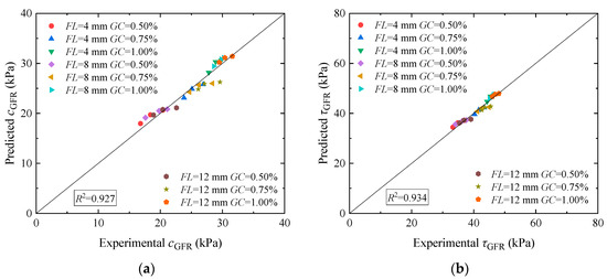 To verify model reliability, the c0, GC, FL, and FC of the loess, along with the shear strength index parameters a and b of the guar gum and basalt fiber-solidified loess, were brought into Equation (3) to determine the cohesion of guar gum and basalt fiber-solidified loess. The shear strength of the guar gum and basalt fiber-solidified loess was calculated by bringing parameters a and b into Equation (6). Figure 11a compares the predicted cohesive force of the solidified loess with that of the tested loess. It can be found that the data of the predicted cohesive force and tested cohesive force are evenly distributed on both sides of parallel lines. Figure 11b compares the predicted and tested shear strength of the solidified loess. It can be seen that the data of the predicted and tested shear strength are more concentrated on both sides of the parallel lines, indicating that the predicted shear strength of the solidified loess agrees well with the test results. By comparing the cohesive force and shear strength, the forecast values align with the experimental values, which shows that the model is appropriate for forecasting the cohesive force and shear strength of guar gum and basalt fiber-solidified loess.