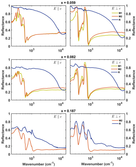 While pure VO2 has a tetragonal rutile (P42/mnm) structure labeled R in the metallic phase and an insulating monoclinic M1 (P21/c) structure in the low–temperature insulating phase, Ti–doped samples can present also a secondary monoclinic structure (C2/m) called M2, which has half of the V–V pairs dimerized and half of them tilted along the direction [7,18]. Samples with x = 0.059 and x = 0.082 are in the M1 phase at room temperature, pass through the M2 phase, and reach the metallic R phase as the temperature increases. In contrast, samples with x = 0.187 do not show the M1 phase (V–V bond formation is hindered by the presence of the high concentration of titanium) and go from the M2 phase to the metallic R phase directly [18]. The surfaces of all samples were polished with diamond powder polishing suspension down to a surface roughness of about 300 nm for the reflectivity measurements. To study the infrared optical properties of these samples, polarized reflectivity measurements were performed at the SISSI beamline [21] of the Elettra synchrotron facility, in the spectral range between 200 cm−1 and 15,000 cm−1, with a resolution of 4 cm−1. Spectra were collected by probing in a direction parallel () and perpendicular () to the long axis of each crystal via a Vertex 70v interferometer (Bruker) coupled with a Hyperion 2000 microscope. Two detectors were employed to cover this frequency range, a liquid-nitrogen-cooled MCT from 500 cm−1 to 15,000 cm−1 and a liquid-helium-cooled bolometer from 200 cm−1 to 500 cm−1. Temperature control of the sample was performed with a THMS350 Linkam stage, allowing the measurement of all the samples at 300 K for the “low temperature” insulating phase and at 372 K for the “high temperature” conductive rutile phase. The high temperature was set above the highest ∼365 K of the doped samples, which is the one with x = 0.187 doping [18]. Reflectance spectra, R(), of the samples, showed in Figure 1, were obtained from the ratio between the intensity reflected by the sample IR (ω) and the intensity hitting the sample, I0(ω). The reflectivity data were analyzed with RefFIT software (Version 1.3.05), which allowed for the extraction of the optical properties of each sample in a form due to the Drude–Lorentz semiclassical approach, with the help of a Kramers–Kronig constrained variational method [22].