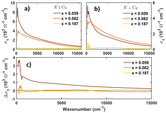 Real part of the optical conductivity of TixV1−xO2 single crystals in the R phase obtained with polarization (a) parallel and (b) orthogonal to the growth axis, . Brown, orange, and yellow lines denote Ti doping with x = 0.059, x = 0.082, and x = 0.187, respectively. (c) Difference between the real part of the optical conductivities obtained with parallel and orthogonal polarization under fixed doping, as defined in Equation (1).