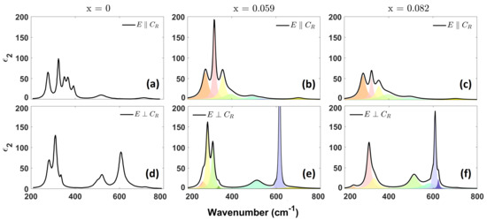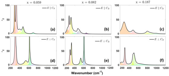The imaginary part of the dielectric function as a function of frequency, , with polarization parallel to the growth axis of the crystals, is shown in Figure 4a–c with different doping conditions. The group at frequencies 250 ÷ 400 cm−1 has an intensity that is drastically reduced from x = 0.059 to x = 0.082 and x = 0.187. The peak at about 700 cm−1 almost disappears from x = 0.082 to x = 0.187, and we observe the merging and broadening of the peaks at about 300 cm−1 at x = 0.187. We remark upon the appearance of a group of phonons at 800 ÷ 1000 cm−1 in the sample with x = 0.187, possibly due to clusters caused by the presence of titanium.