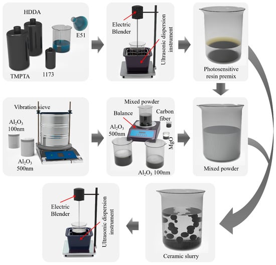 The preparation of Al2O3 ceramic slurry involves three steps [22], as illustrated in Figure 2. The first step is the preparation of the photosensitive resin. HDDA, TMPTA, and E51 resin are initially mixed in a mass ratio of 1:1:1, followed by the addition of 1 wt.% photoinitiator (1173). The preliminary mixture is then stirred using an ultrasonic cleaner (JP-010 T, Shenzhen Jie Meng Cleaning Equipment Co., Ltd., Shenzhen, China) and an electric mixer (JJ-160 W, Jintan District Xicheng Xinrui Instrument Factory, Changzhou, China) for 20 min under ultrasonic conditions. The second step involves mixing the powder with the photosensitive resin. Al2O3 particles with diameters of 500 nm and 100 nm are initially mixed in a mass ratio of 4:1, followed by the addition of 1 wt.% magnesium oxide. This mixture is then combined with the photosensitive resin prepared in the first step at a ratio of 7:3 and stirred under ultrasonic conditions for 2 h to obtain the final Al2O3 ceramic slurry. The third step is the addition of the carbon fiber additive. Different mass fractions of carbon fiber (0 wt.%, 0.1 wt.%, 0.2 wt.%, and 0.3 wt.%) are added to the prepared Al2O3 ceramic slurry and stirred under ultrasonic conditions for 1 h to obtain three slurries with varying carbon fiber content. The ceramic slurry components are evenly distributed due to prolonged stirring with an electric mixer under ultrasonic conditions. Additionally, because the carbon fiber powder is black, mixing it with the ceramic slurry results in a darker color. This darker color absorbs light, which adversely affects the photopolymerization process of the ceramic [23]. Therefore, only a small amount of carbon fiber can be added. During practical experiments, it was found that when the carbon fiber content was 0.4 wt.%, the samples could not be formed due to poor curing performance. Therefore, only a small amount of carbon fiber can be added. Consequently, the experiment results in four types of ceramic slurry with carbon fiber contents of 0 wt.%, 0.1 wt.%, 0.2 wt.%, and 0.3 wt.%.
