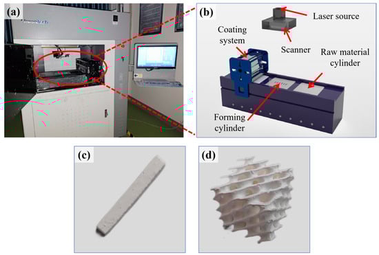 To fabricate ceramic parts using AM, the process begins with creating a 3D model using Solidworks. The model is then sliced using Voxeldance Additive 4.1.10 slicing software, and the resulting slice files are uploaded to the computer integrated into the stereolithography 3D printer (AME RP1500, UnionTech, Shanghai, China), as shown in Figure 3a. For this experiment, two distinct 3D models were designed: one is a solid rectangular prism with dimensions of 30 mm × 3 mm × 4 mm, as shown in Figure 3c; the other is a cube with a side length of 12 mm, featuring an internal honeycomb structure resembling a lattice, as shown in Figure 3d. In ceramic additive manufacturing, the selection of geometric shapes and dimensions for these two samples is based on previous research. The cuboid is the standard specimen for three-point bending tests. The choice of a honeycomb-patterned cube not only demonstrates the capability of additive manufacturing to create parts with complex internal structures but also facilitates mechanical and structural analysis. These shapes are widely used in material testing due to their simplicity and ease of fabrication and measurement. Before the actual printing, it is essential to carefully check and calibrate the equipment to ensure everything is functioning correctly. To accurately estimate the required printing time, a simulation print of the slice file is conducted. Once confirmed, the actual printing process can commence. The printer’s parameters for ceramic additive manufacturing are listed in Table 3. During printing, the laser source emits ultraviolet light to cure the ceramic slurry layer by layer, gradually building the preliminary ceramic green body, as shown in Figure 3b. After printing, the ceramic green body must be manually cleaned to remove any supports and excess slurry adhered to the surface of the part. To eliminate organic components and enhance the density and stability of the parts, the green ceramic bodies undergo debinding and sintering at high temperatures. To ensure the accuracy of the subsequent experimental data, 20 parts were produced for each of the two models at each concentration.