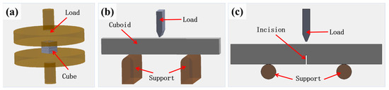Schematic of mechanical tests. (a) Compression test, (b) three-point bending test, and (c) single-edge V-notch beam test.