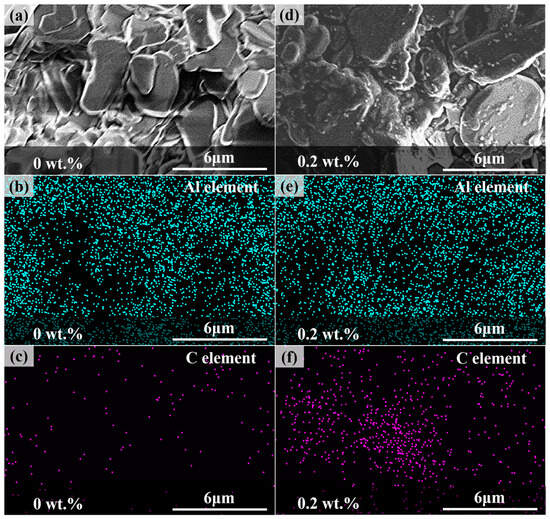 EDS images. (a) Testing area of the sample without carbon fibers, (b) distribution of Al element, (c) distribution of C element, (d) testing area of the sample with 0.2 wt.% carbon fibers, (e) distribution of Al element, and (f) distribution of C element.