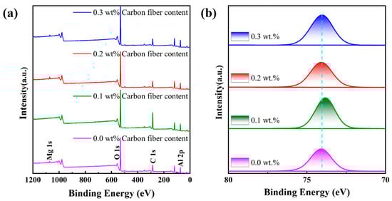 The chemical elemental composition of the sintered samples was characterized using XPS, as shown in Figure 10. The peak at 284.8 eV corresponds to the presence of carbon [45], which can be attributed to two main factors: first, prolonged exposure of the sample to air, which contains carbon; and second, the carbon fiber additive introduced during the process. Analysis reveals that, except for a slight rightward shift in the binding energy of the sample with 0.1% carbon fiber, the binding energies of the other samples show no significant change. This indicates that the addition of carbon fiber does not increase the binding energy of Al elements. For the C element, the peak at 284.8 eV is notably higher in samples containing carbon fiber, and the peak intensity increases with the carbon fiber content, consistent with the results of the EDS and XRD analyses. Additionally, the peak at 74.6 eV corresponds to Al, with its fine spectrum shown in Figure 10b.