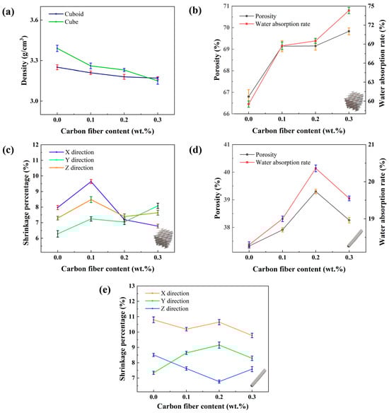 Influence of carbon fiber content on physical properties. (a) Density variation curves of rectangular and cubic samples, (b) shrinkage rate variation curve of rectangular samples, (c) shrinkage rate variation curve of cubic samples, (d) porosity and water absorption variation curves of rectangular samples, and (e) porosity and water absorption variation curves of cubic samples.