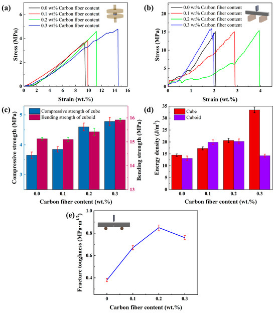 Influence of carbon fiber content on mechanical properties. (a) Stress–strain curve of compression test, (b) stress–strain curve of three-point bending test, (c) bending strength of rectangular prism and compression strength of cube, (d) energy absorption density, and (e) toughness.
