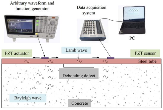 Concrete-filled steel tube (CFST) members have been widely used in high-rise buildings, long-span bridges, and complex engineering projects due to their high load-carrying capacity, economic efficiency, convenient construction, and so on. However, due to the poor quality control approaches in concrete pouring technology and inevitable concrete shrinkage and creep in service, interface debonding defects between the concrete core and steel tube occur with high possibility, which directly affects their mechanical properties including load-carrying capacity and stiffness and seriously threatens their safety and serviceability [1,2,3,4]. Therefore, effective non-destructive testing (NDT) methods for interface debonding defect detection of existing CFST members is critical.